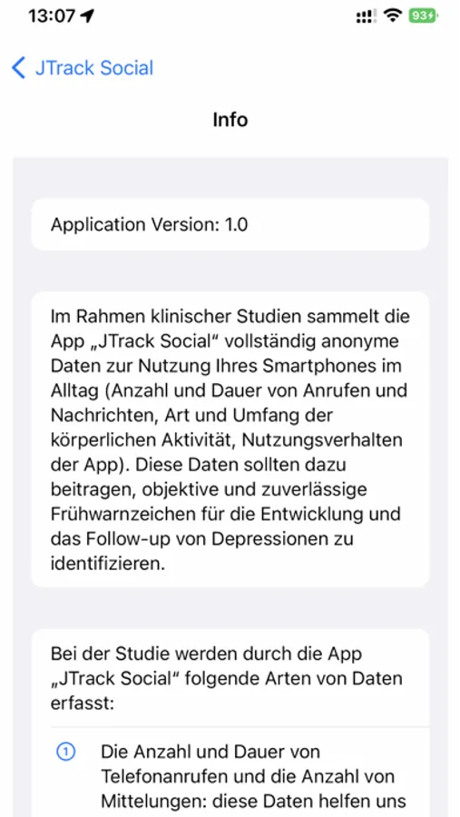 In the course of clinical studies, the "JTrack Social" app collects completely anonymous data on the use of your smartphone in everyday life (number and duration of calls and messages, type and amount of movement activities, app usage behavior). This data should help to identify objective and reliable early detection signs for the development and monitoring of neurological diseases such as dementia and Parkinson's disease.