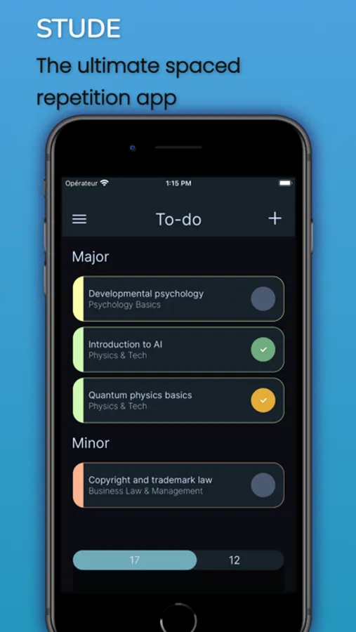 With Stude, you will never forget a chapter again. This game-changing app uses spaced repetition to generate a to-do list each day, tailored to your goals and subject mastery.