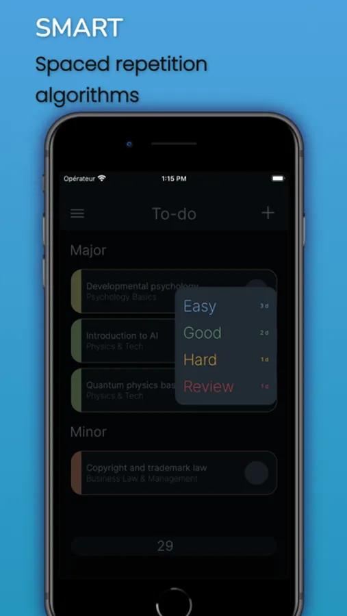 Stude relies on carefully crafted algorithms to assist you in retaining your courses for the long term. These algorithms take into account your daily feedback to adapt to your needs.