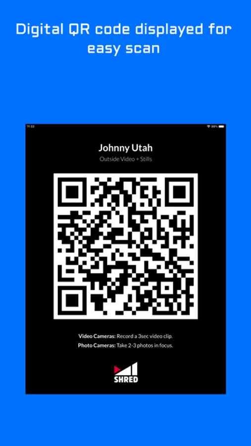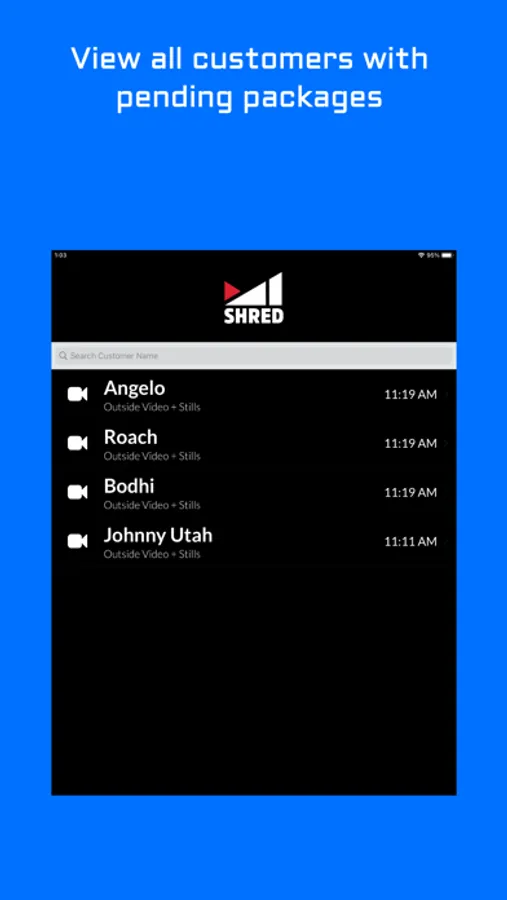 Look up your customer QR codes from anywhere onsite with the Shred Video QR Display app for iPad. Select your customer from a list, or look them up with easy search. Tap your customer name to pull up their QR code, and tap anywhere to dismiss. Customers disappear when their media package begins processing to keep your list nicely managed.