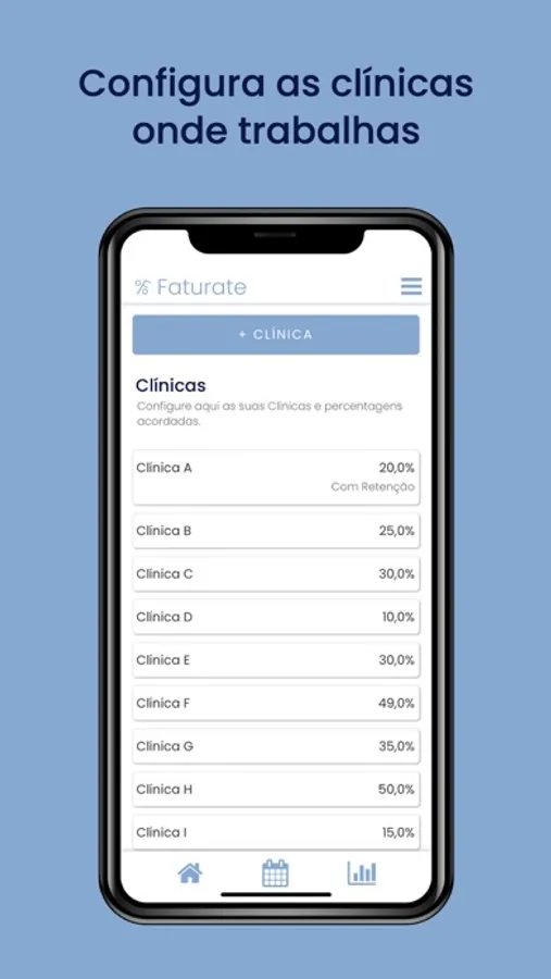 - Configura as clínicas em que trabalhas e as percentagens acordadas em cada uma delas.