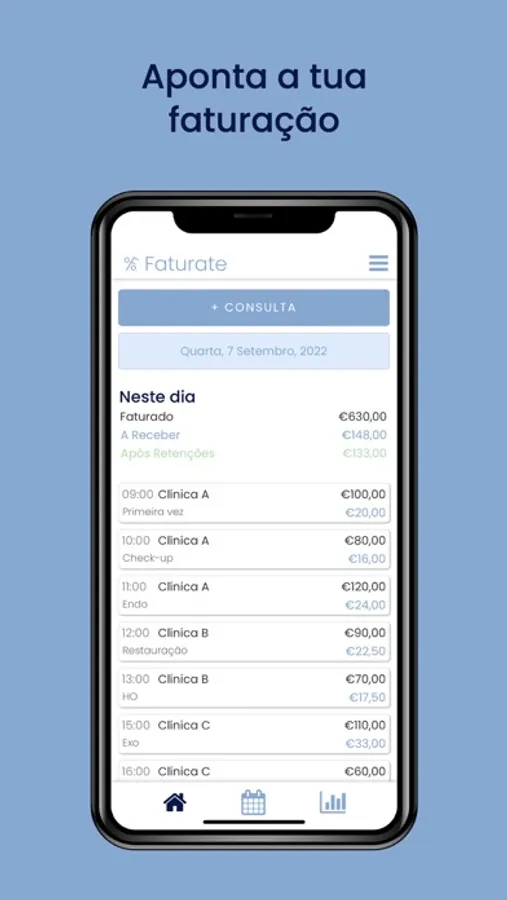 - Regista a faturação das tuas consultas, contabiliza os custos e outros valores fixos.