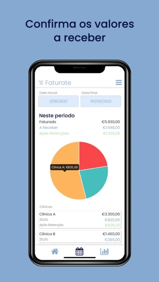 - Os valores a receber em cada clínica são calculados automaticamente e podes confirmar quanto tens a receber.