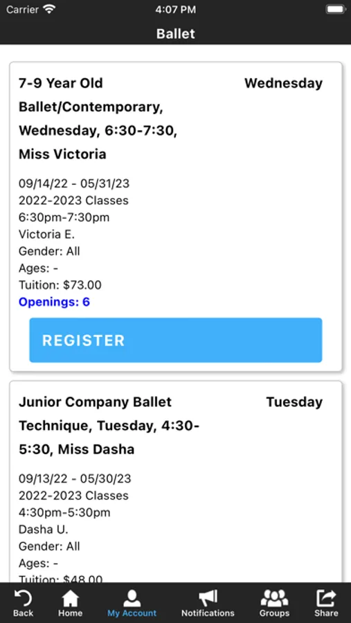 The Rising Stars app allows you to manage your account with ease, register for classes, parties, and special events. You'll also receive important notifications about class changes, closings, registration openings, special announcements, and upcoming events.