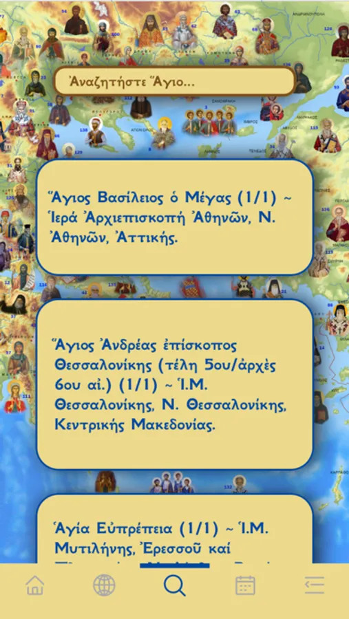 Επιπλέον, η εφαρμογή ενσωματώνει τους Χάρτες της Google, παρέχοντας μια οπτική αναπαράσταση των Περιφερειών, των Νομών και των Μητροπόλεων που σχετίζονται με τους αγίους. Οι χρήστες μπορούν να περιηγηθούν στους χάρτες, επιλέγοντας Περιφέρειες, Νομούς και Μητροπόλεις για να εξερευνήσουν τον αντίστοιχο κατάλογο αγίων. Για να εμφανιστούν οι χάρτες μπορούν να πατήσουν το εικονίδιο τέρμα επάνω.