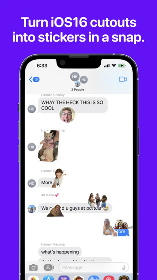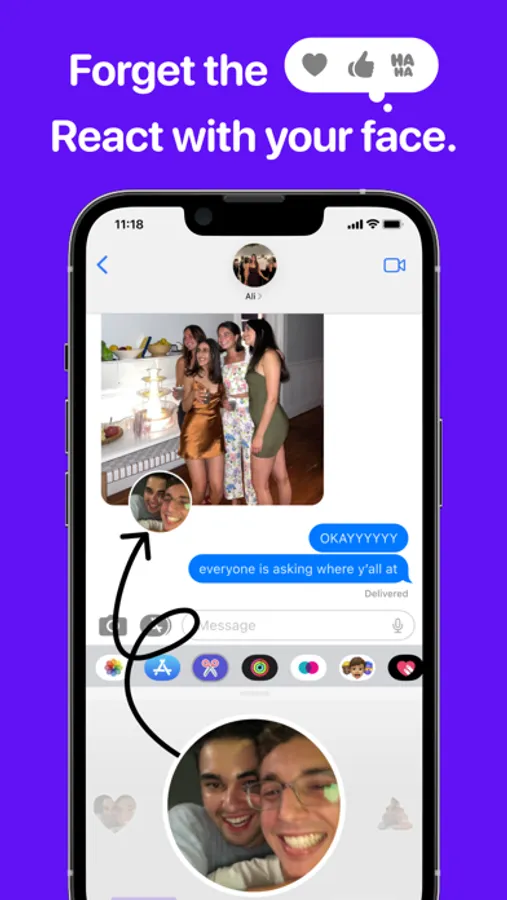 Welcome to Cutouts for iMessage! Simply snap a pic and drag it on a message to react with your face.