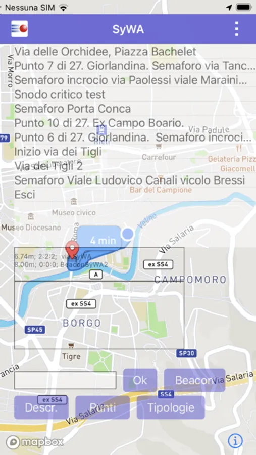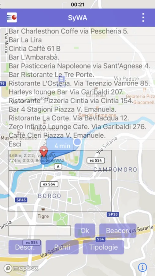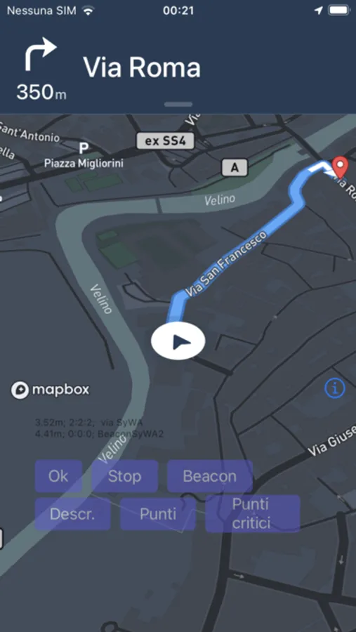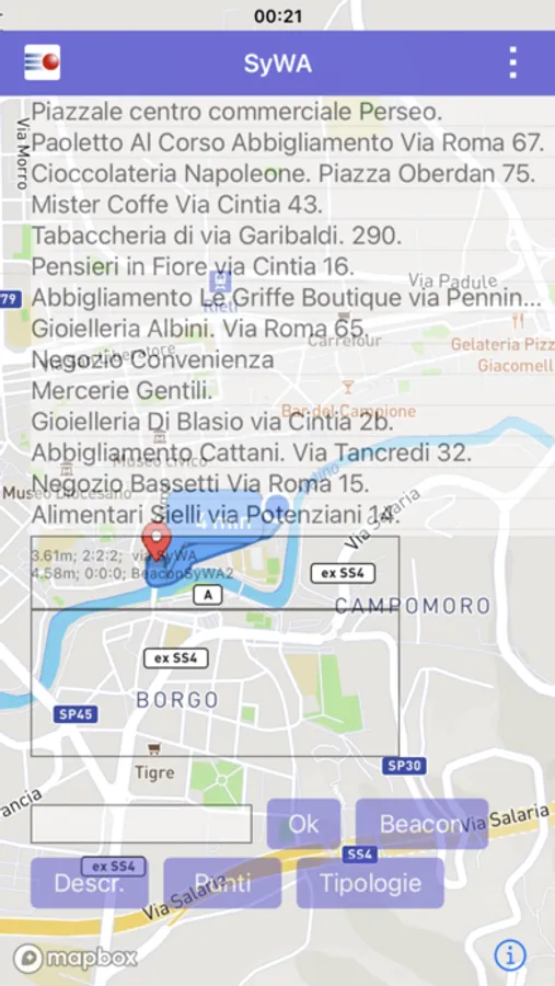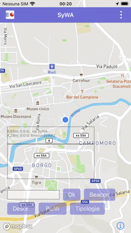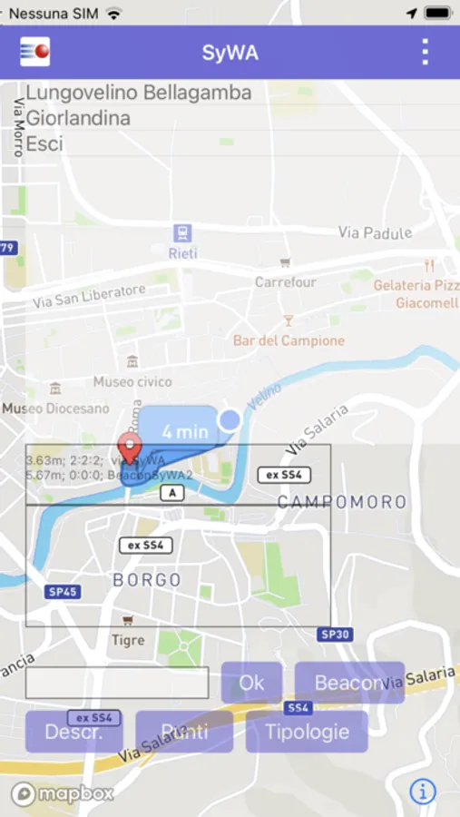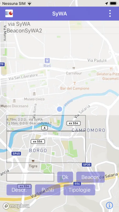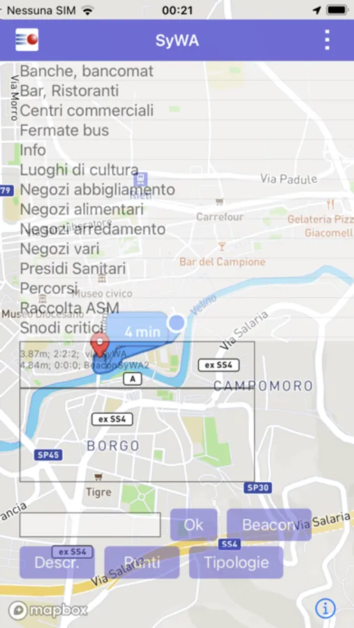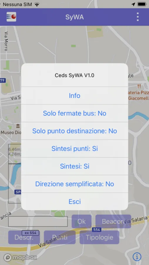 The SyWA app is a navigation utility dedicated to blind people, and allows these people to reach, by walking, the set destination point, providing vocal indications relating to turns and the presence of points along the route, inserted in a server. The destination points can be chosen by explicitly writing the desired street or by selecting points belonging to certain types, for example pharmacies, bus stops, etc. The app also manages points identified by the presence of BLE Tags, installed in places of particular interest, such as shops. Initial versions of the app may implement only some of the features.