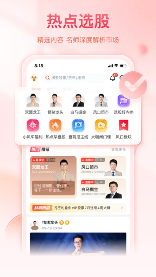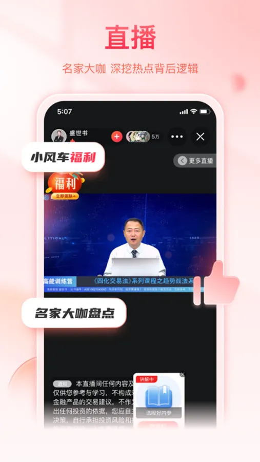 陪伴式教学直播——全天24小时直播。每个交易日,早九晚十,名家实时股票在线教学,热点、学习、资讯答疑一网打尽,捕捉每一个市场机会,实时把握股票行情。