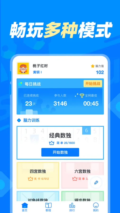 2.数独达人包含多种模式的数独,除经典九宫格数独之外,还包含适合儿童的四宫数独、六宫数独以及难度升级的锯齿数独、对角线数独。