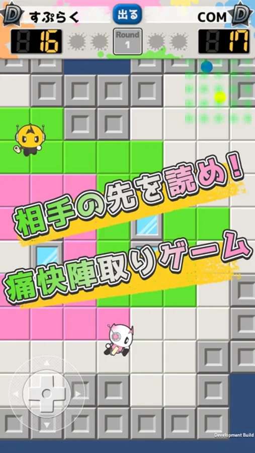 マイキャラを縦横に操作してフィールド上のタイルに色を塗り、相手キャラより多くタイルを塗った方が勝ちです。