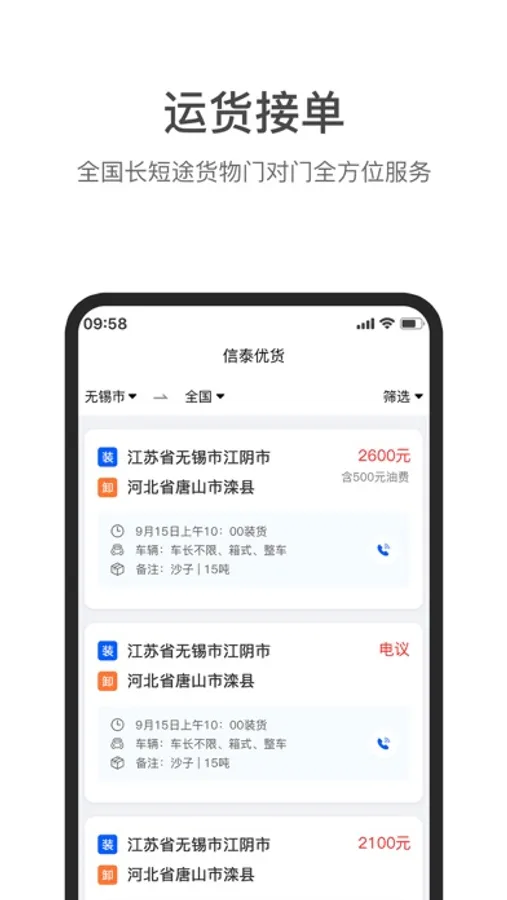1.运货接单:全国长短途货物门对门全方位服务;