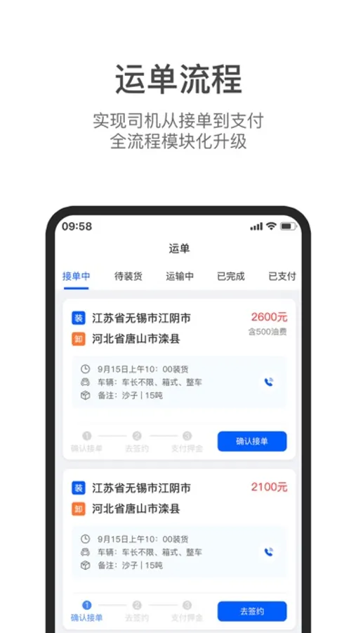 2.运单流程:实现司机从接到到支付,全流程模块化升级;