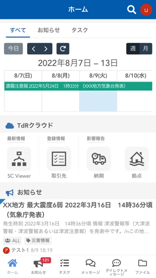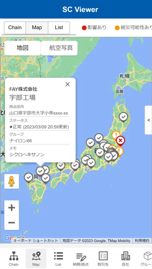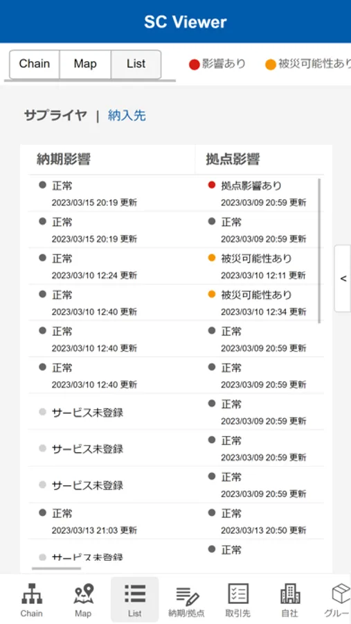 ・本サービスに登録した取引先(納入先、サプライヤ)に自然災害などのBCPに関わる事象が発生した場合にお知らせします。対象企業にコミュニケーションして、被災状況や納期に関わる影響など確認・集約することができます。