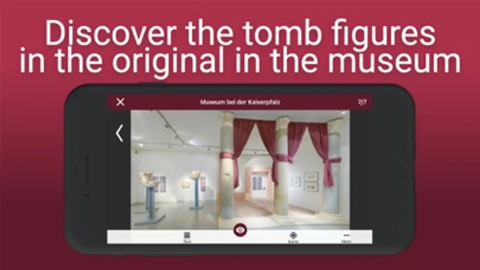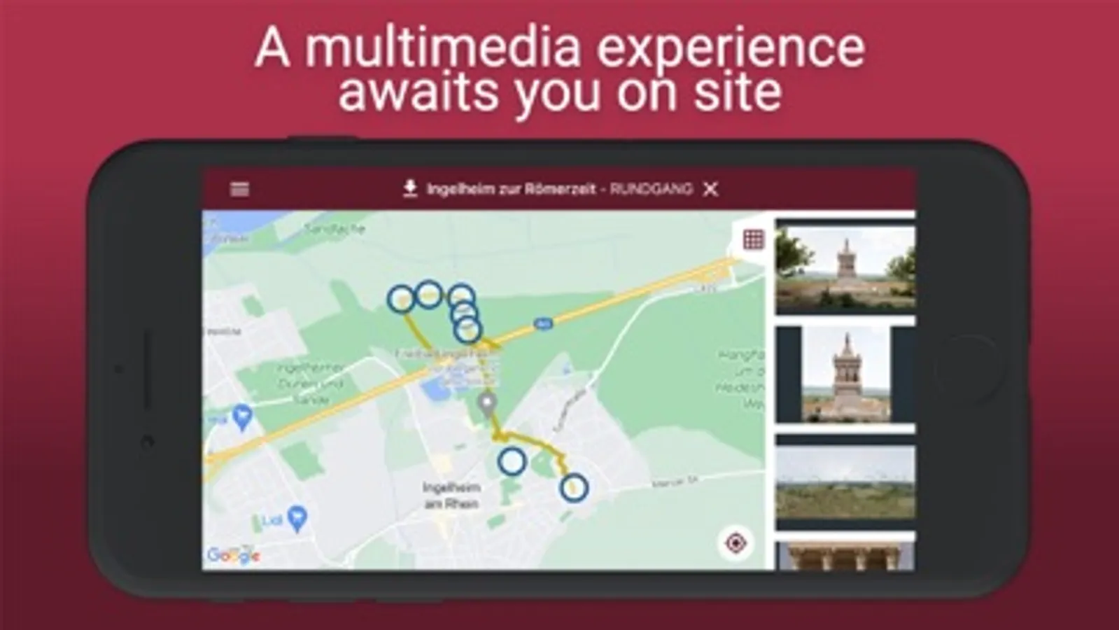 The app "Ingelheim in Roman times" links objects from the "Museum bei der Kaiserpfalz" with their discovery sites. Through 360° panoramas in augmented reality, videos and images, the Roman environment of the 1st century AD in Ingelheim is brought to life.