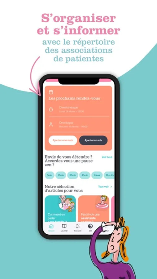 · Pour s’organiser et s’informer sur les effets des traitements, les soins de support, le maintien ou la reprise de la vie professionnelle, les associations de patients, décrypter les termes médicaux, noter vos rendez-vous…