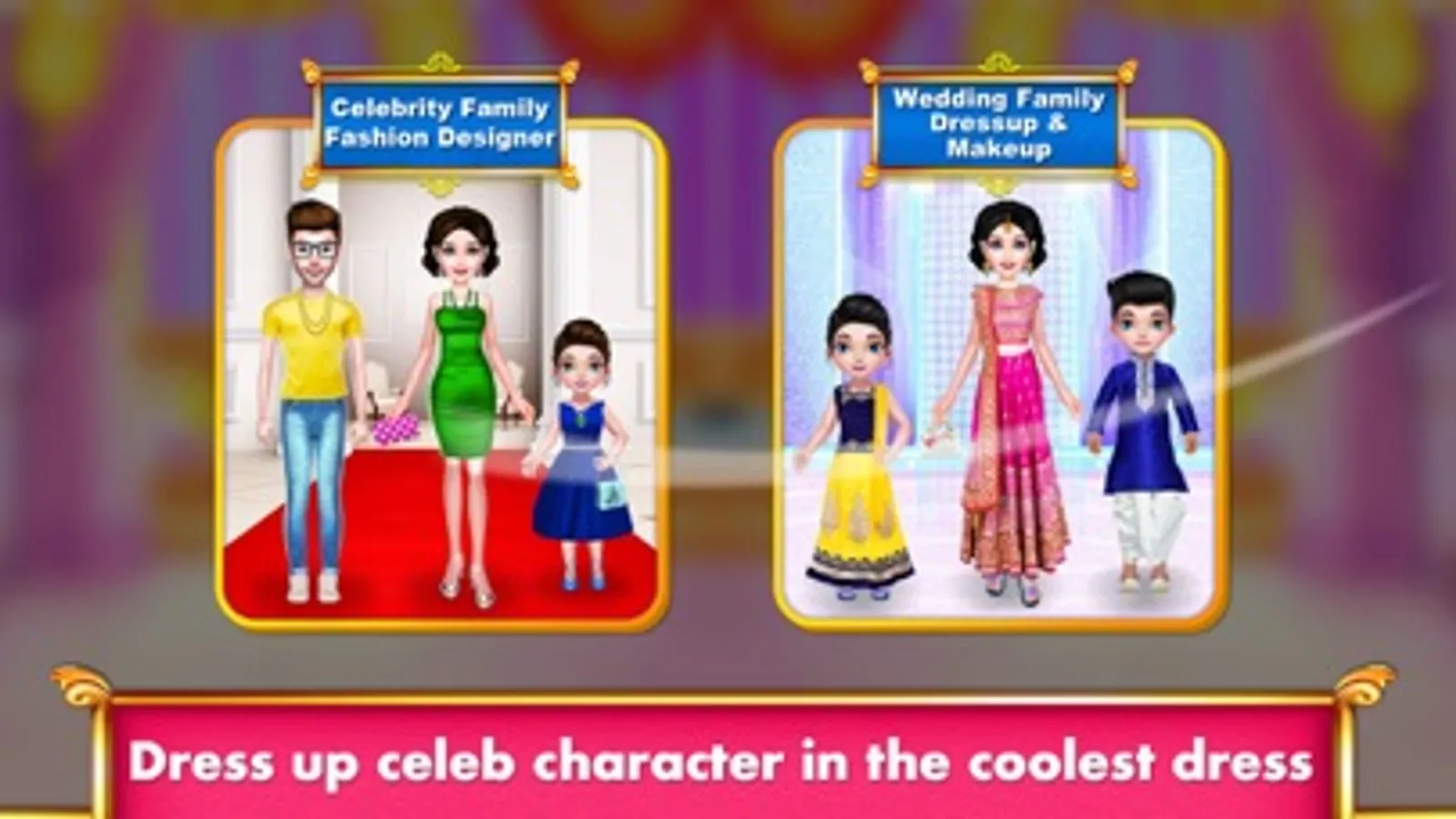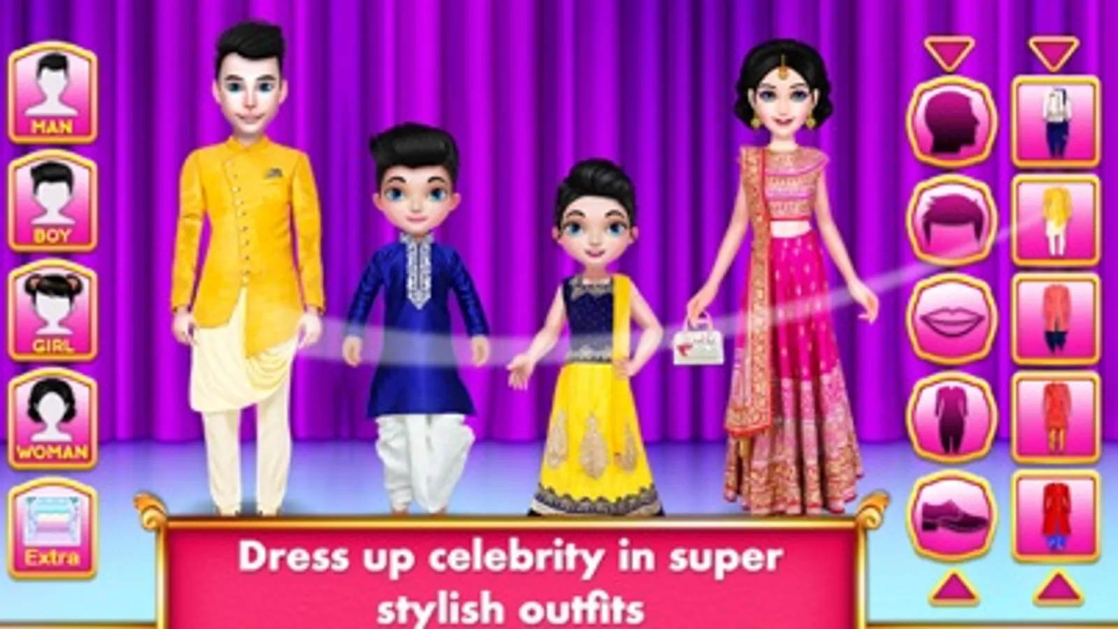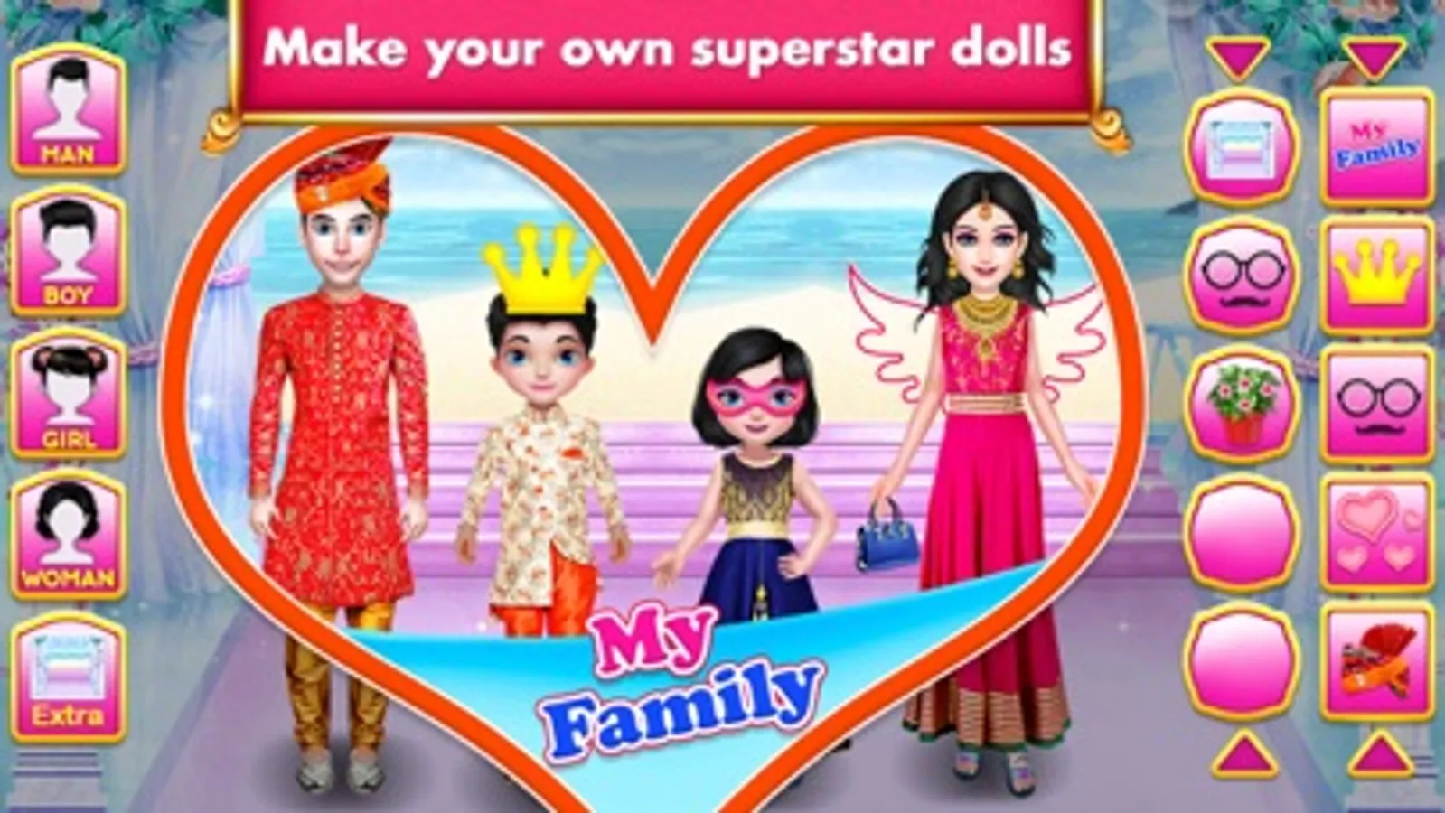 We bring four gorgeous designing of virtual models with dozens of apparel, accessories, makeup, funny stickers and more. Show off your fashionista talent to your friends and family online by sharing your creation on social media. Select background that suits the dressing style of the family. Whether it is a hill station trip or a red carpet walk, whether it is a family photoshoot/photo session in studio or a night club party, whether it is a wedding function or a casual house wear, picnic in the park or living room of house, pick perfect apparels for famous family. Huge collection of garments and trendy options for makeup will add some charm to the family dolls.