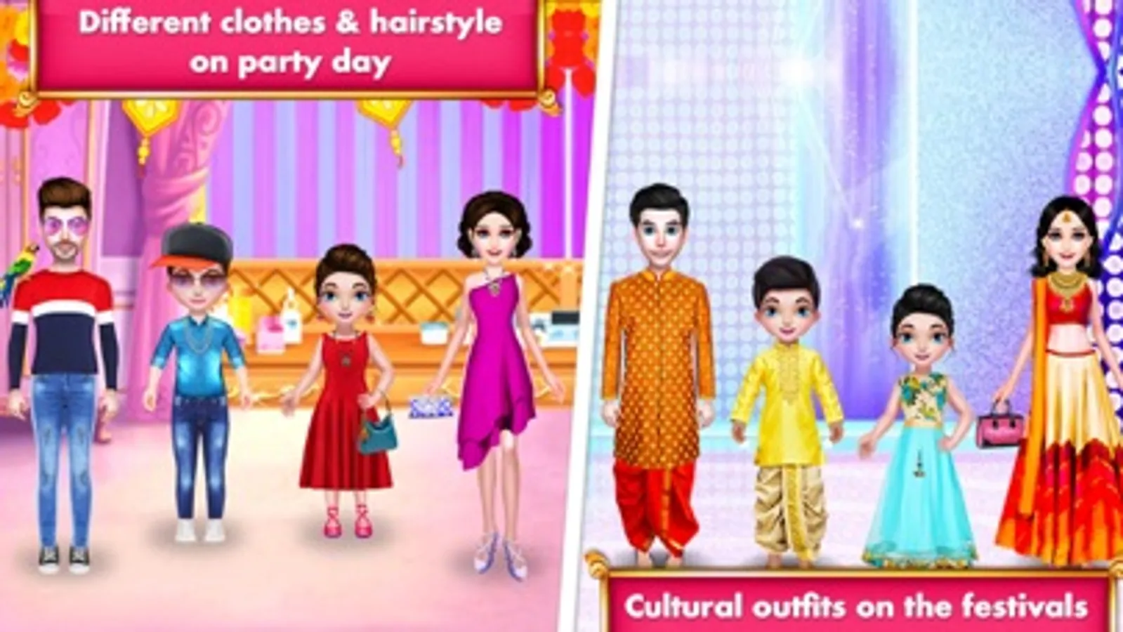 Short skirts, high-heel shoes, dresses and fashionable accessories for the high school celeb girl and boy. Various facial features and make-up options are really beautiful. Be sure to tap on “More Games” button to play our more styling and cosplay girl apps. Play fun design family salon game where you can create your very own family look. Luxurious jewelries digging from your massive closet. Try on jeans, shorts, skirts, sweatpants for girls. Apply makeup cosmetics on mom and girl. This image maker of teen children and mom-dad will give you goosebumps for hours.