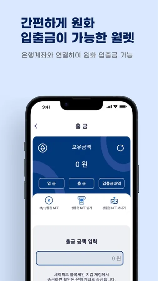 - 원화를 간편하게 내 지갑에 입금하고 출금이 가능하여 세이퍼트 블록체인 월렛과 연결된 NFT 마켓에서 원화로 NFT를 구매, 판매하는데 이용할 수 있습니다.