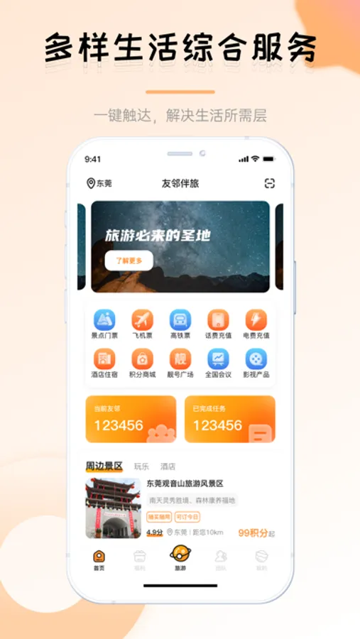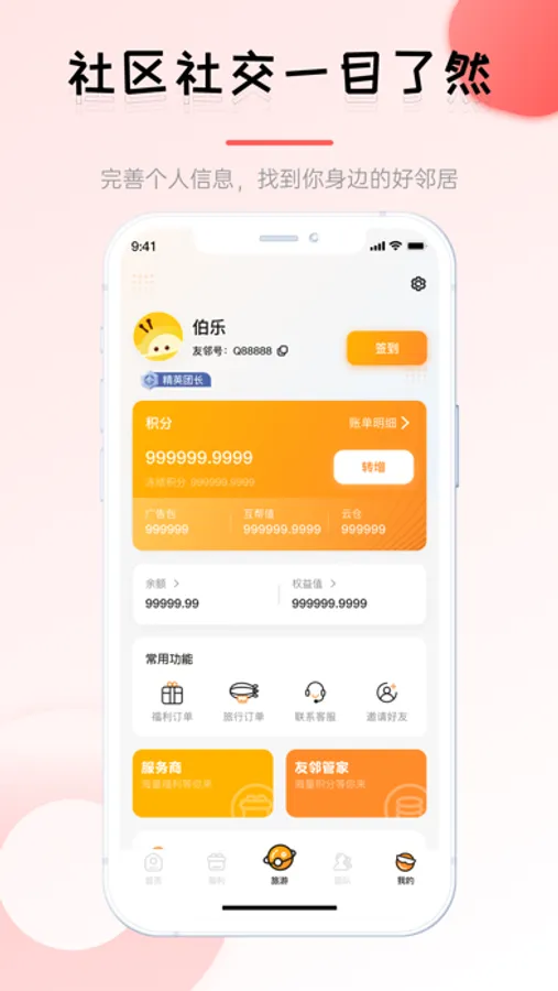 友邻社区生态完善,便携社交、免费旅游一网打尽。