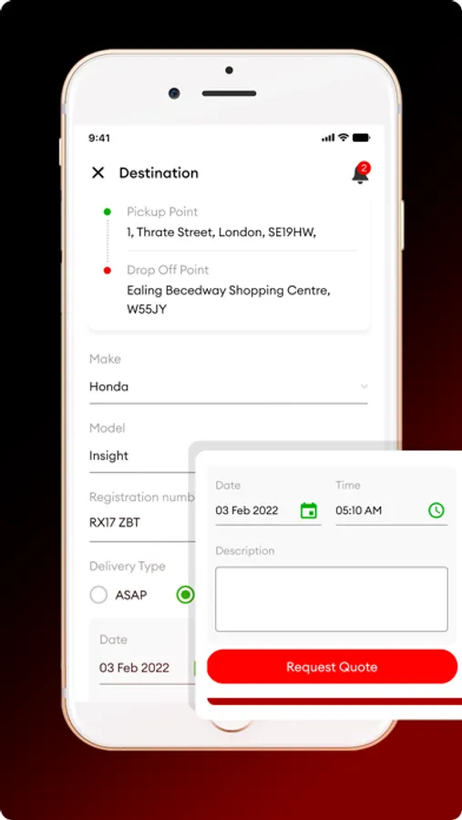 A Driver will be able to see the request of the customer as a popup notification. Receive notifications on the go. Download MyCarRecovery app now and stay safe. Once registration is completed we offer you to recover your vehicle from point A to point B at the best competitive price you choose without any hussle."