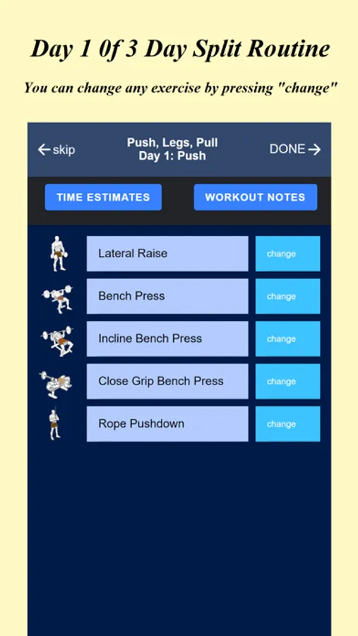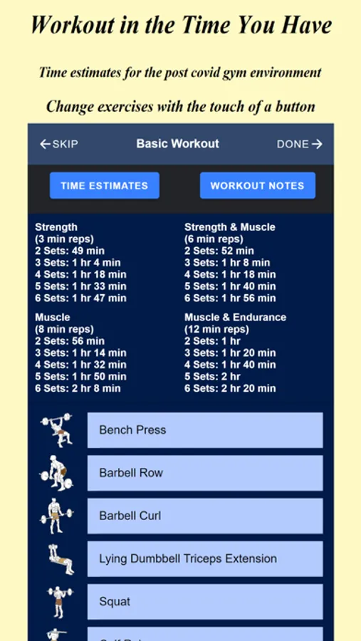 Bodybuilder HELPER provides estimated workout times for different sets and reps. This feature enables you to select the appropriate sets and reps that can be completed within your allotted time frame.