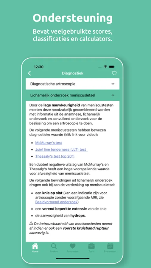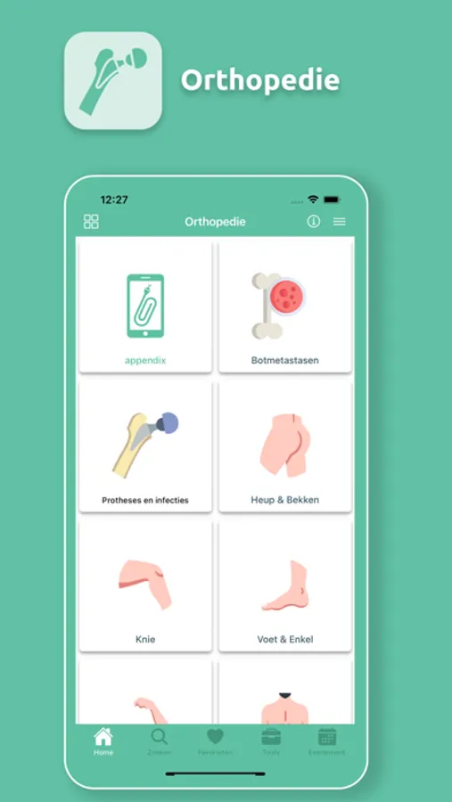 De app 'Orthopedie' is bestemd voor alle zorgverleners die betrokken zijn bij de zorg voor patiënten binnen de orthopedie en aanverwante specialismen, waaronder Sportgeneeskunde en fysiotherapie. Deze app bevat interpretaties van richtlijnen, inclusief interactieve flow-charts en handige calculators, die ook als ‘favoriet’ opgeslagen kunnen worden.