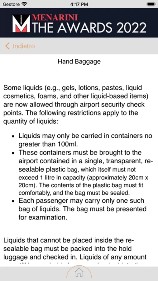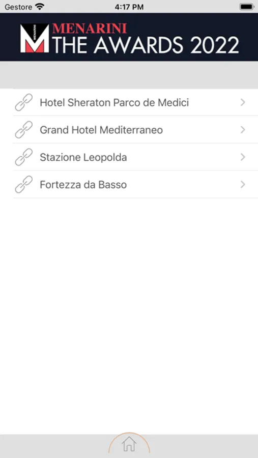 The “Menarini Awards 2022” app provides participants with the details of the logistic and organizational information related to the event. Such information includes a general program, day-by-day agenda, possibility of choosing activities organized for the event, transport, hotel logistics (operating flights, airport pick-ups, etc.) and push notifications. Emergency contact number to contact in case is needed, request facilitation of hotel check-in, personal information such as food restrictions, allergies, special requests, etc.