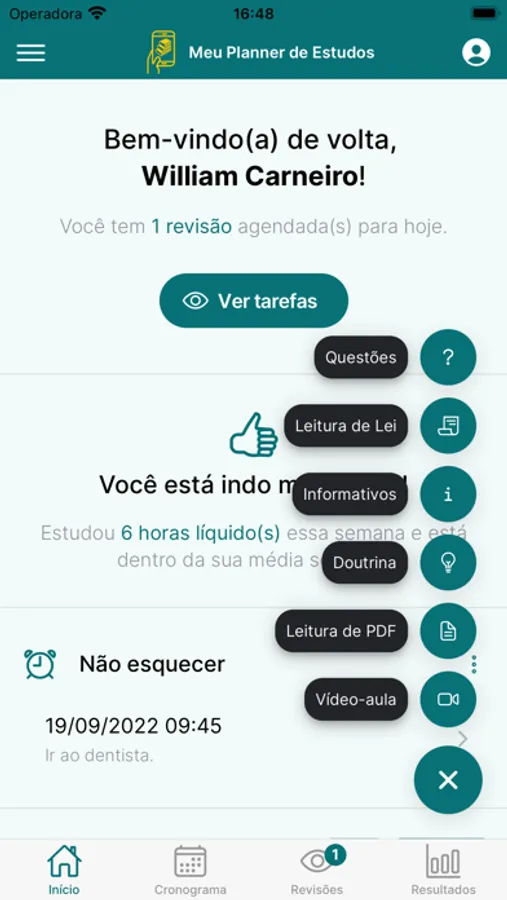 Com o Calendário de Estudos, você fica sabendo de todo o seu cronograma, das revisões pendentes e realizadas, além de poder gravar e editar todas as informações de qualquer estudo e revisão diretamente do calendário.