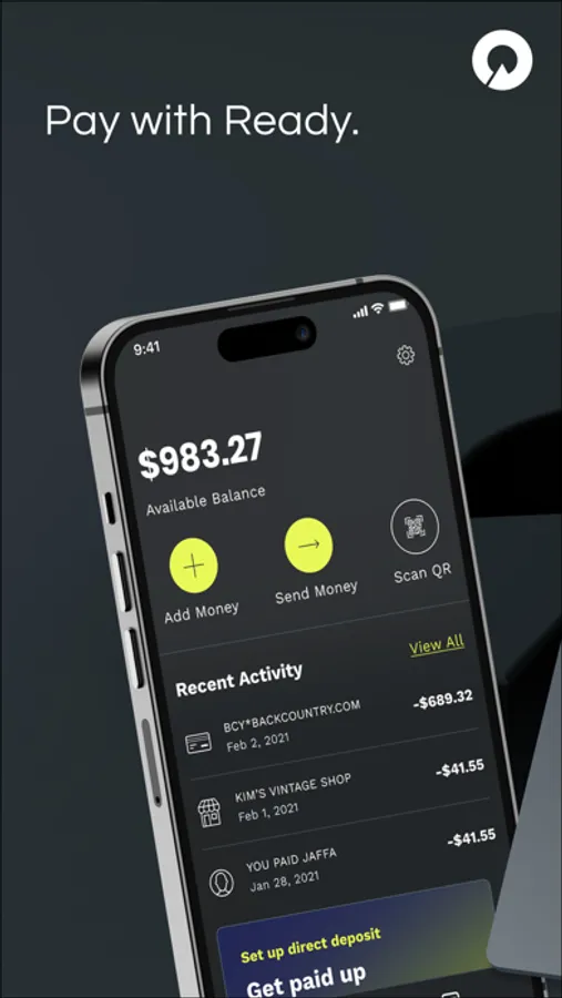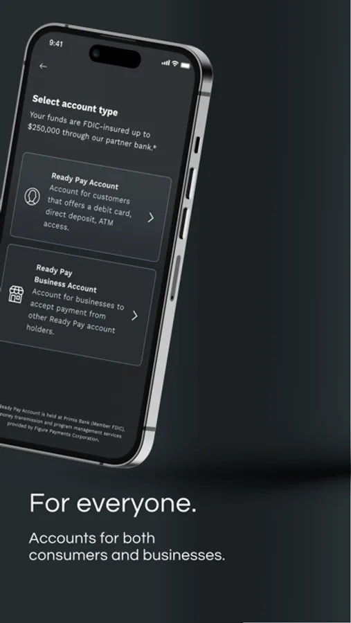 Terms apply. All money transmission services in the Ready Pay app are provided by Figure Payments Corporation. The Ready Pay Visa® Debit Card is issued by Primis Bank (Member FDIC) pursuant to a license from Visa U.S.A. Inc., with program management services provided by Figure Payments Corporation.