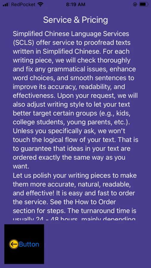 Simplified Chinese Language Services (SCLS) offer service to proofread texts written in Simplified Chinese. Use this app to submit your orders. For each writing piece, we will check thoroughly and fix any grammatical issues, enhance word choices, and smooth sentences to improve its accuracy, readability, and effectiveness. Upon your requests, we will also adjust writing style to let your text better target certain groups (e.g., kids, college students, young parents, etc.). Unless you specifically ask, we won't touch the logical flow of your text. That is to guarantee that ideas in your text are ordered exactly the same way as you want.