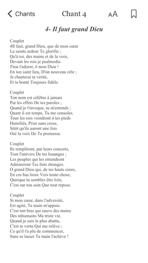 Avec elle, vous pourrez lire vos chants favoris n'importe où, les ajouter dans vos favoris, mais également la grande nouveauté est la capacité de surligner des passages qui vous ont marqués l'esprit.