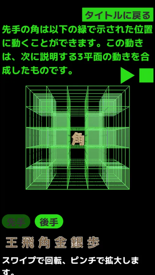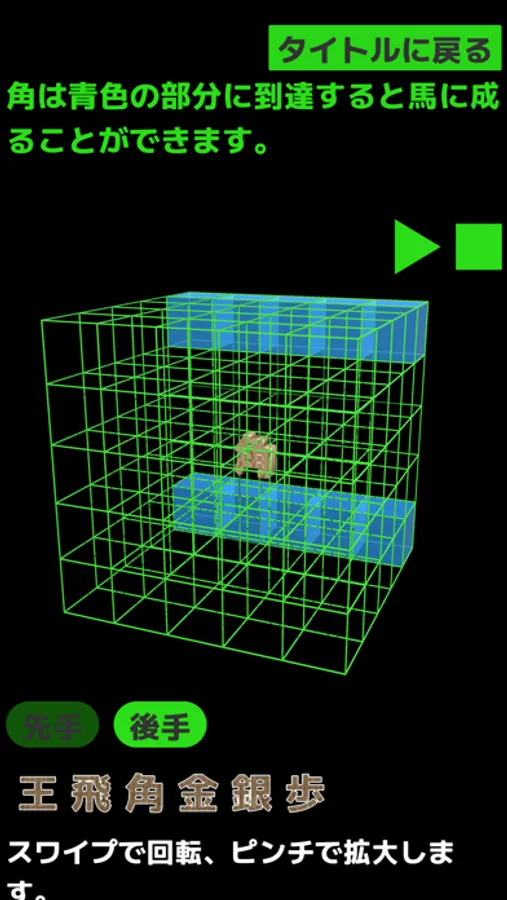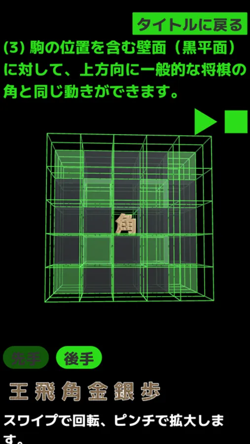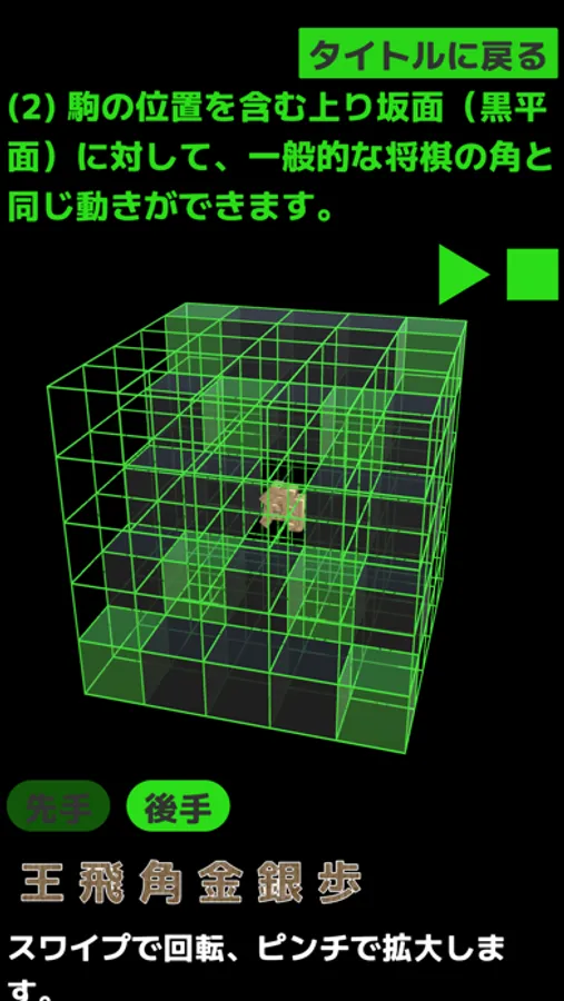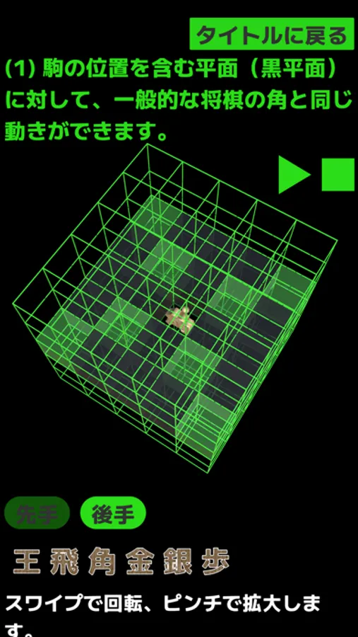 5*5*5のマス目を自由自在に動く、三次元の将棋アプリです。通常の将棋では駒は平面上のみを動きますが、三次元の将棋では平面、坂面、壁面を動きます。日本発の伝統的ボードゲーム「将棋」の新しい可能性を開拓する新感覚のゲームです。