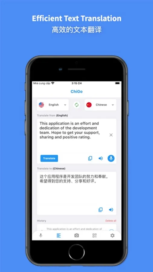 Hi ! ChiGo is the leading Chinese Translator with a lot of outstanding features such as accurate voice translator, translate any text in 45 languages to chinese or chinese to any language such as: English, Korean, German, Japanese, Vietnamese, French, etc and extremely useful photo translating feature or learn chinese more easily.