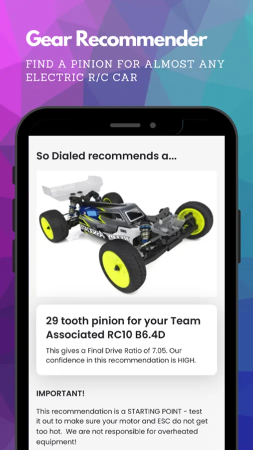 Also, our recommendations are a starting point, so after you try the pinion we suggest, please experiment to see what works best for your driving style and your track, and be sure to record your setups and races in our RC Setup App (link below.)