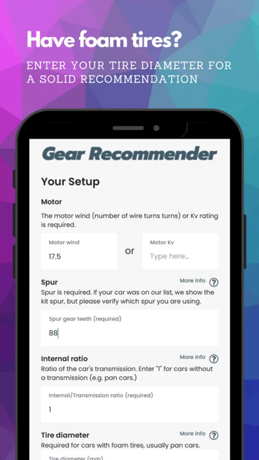 - Cars with foam tires work fine, too - just enter your tire diameter