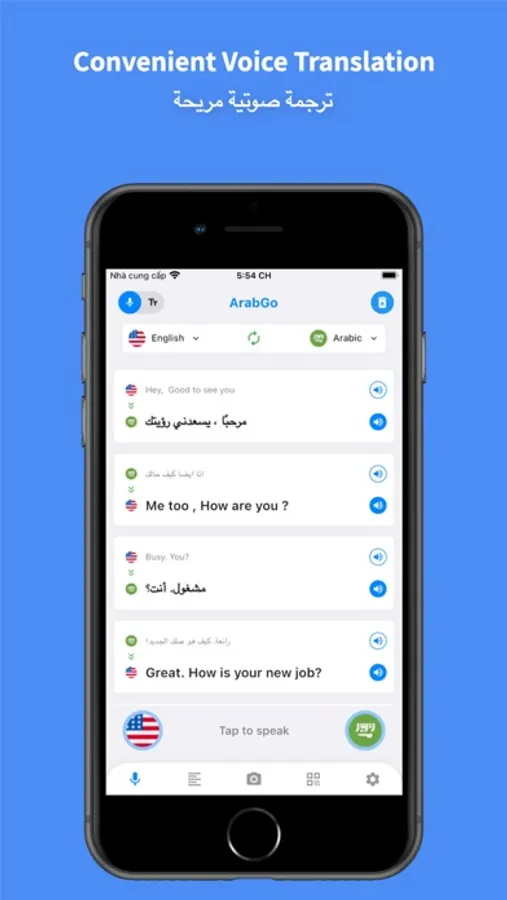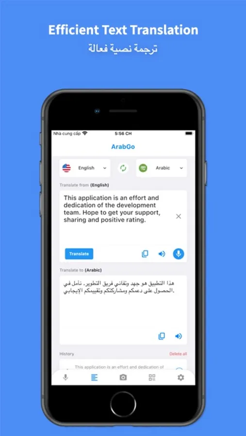 Hi ! ArabGo is the leading arabic Translator with a lot of outstanding features such as accurate voice translator, translate any text in 45 languages to arabic or arabic to any language such as: English, Korean, German, Japanese, Vietnamese, French, etc and extremely useful photo translating feature or learn arabic more easily.
