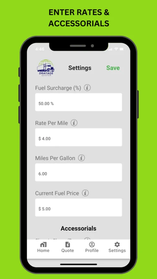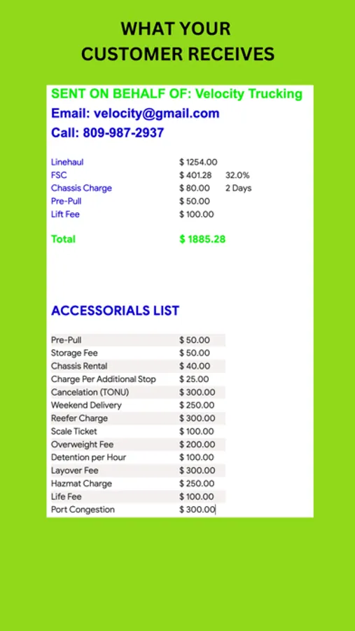 Customize your quote by entering your accessorial charges, such as FSC, Rate Per Mile, Detention, Storage Fee, Chassis Fee and many others.