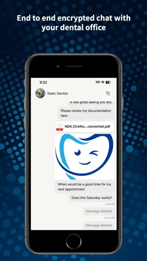 Smile Link is a convenient dental application that allows you to book appointments and chat directly with your dentist. Simply select a convenient time slot, and effortlessly schedule your next visit. Stay connected with your dentist through secure end to end encrypted in-app messaging for easy communication about treatment plans, symptoms, and post-care instructions. With automated reminders and notifications, Smile Link keeps you informed, ensuring you never miss an appointment or forget about your taking care of your teeth. Experience the future of dental care by taking control of your oral health with Smile Link's user-friendly interface and personalized features.