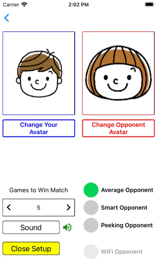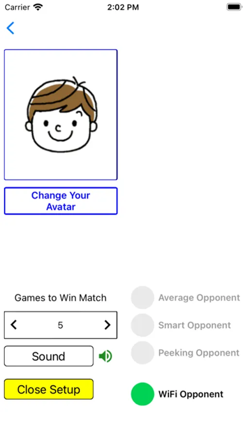 When opened, the program immediately sends you to the WiFi Setup page where you can verify YOUR avatar (or choose a new one), games in a match and sound option. Unlike the Solo Mode, there is only one avatar selection. The opponent will select an avatar on a similar Setup page.