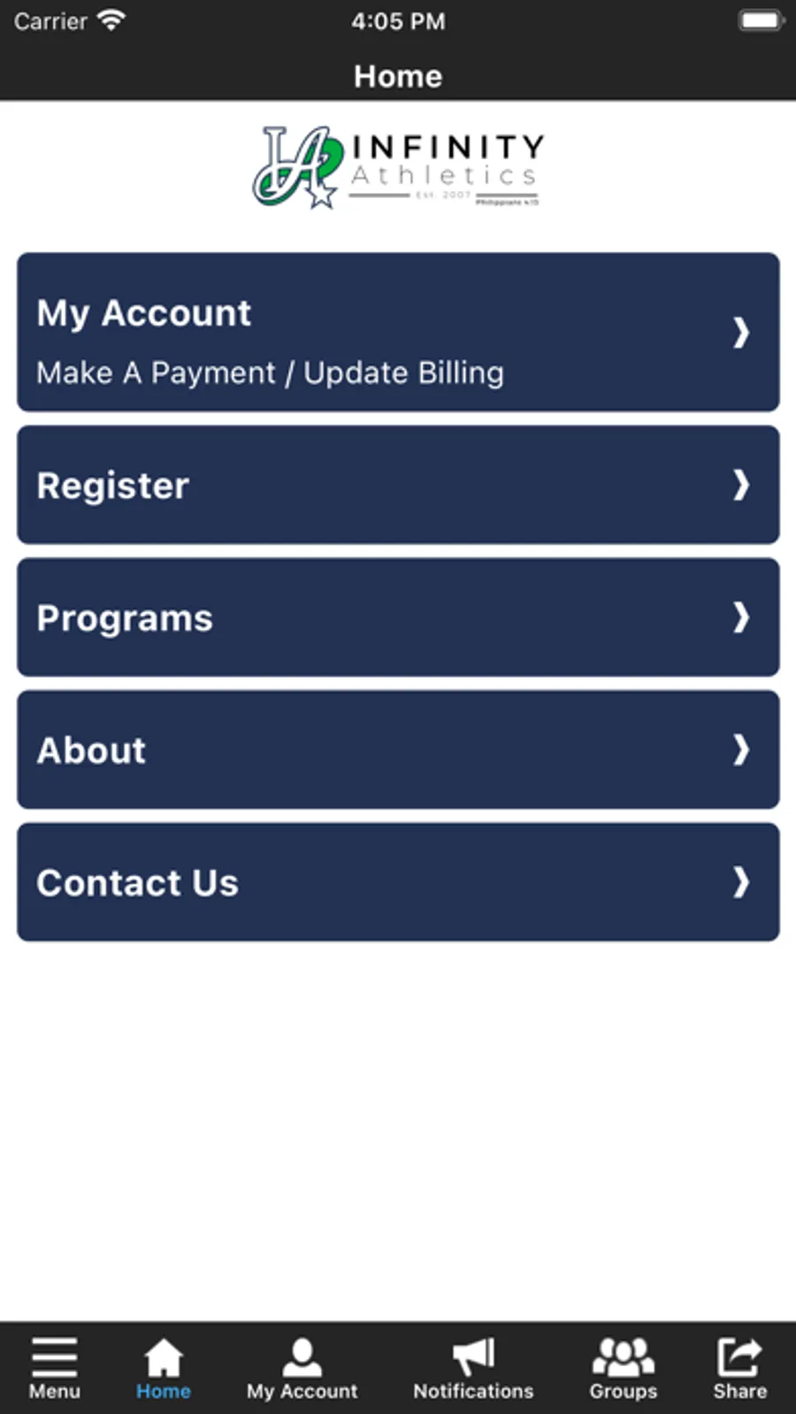 The Infinity Athletics app is an easy-to-use, on-the-go way to access everything Infinity Athletics has to offer right from your smartphone.