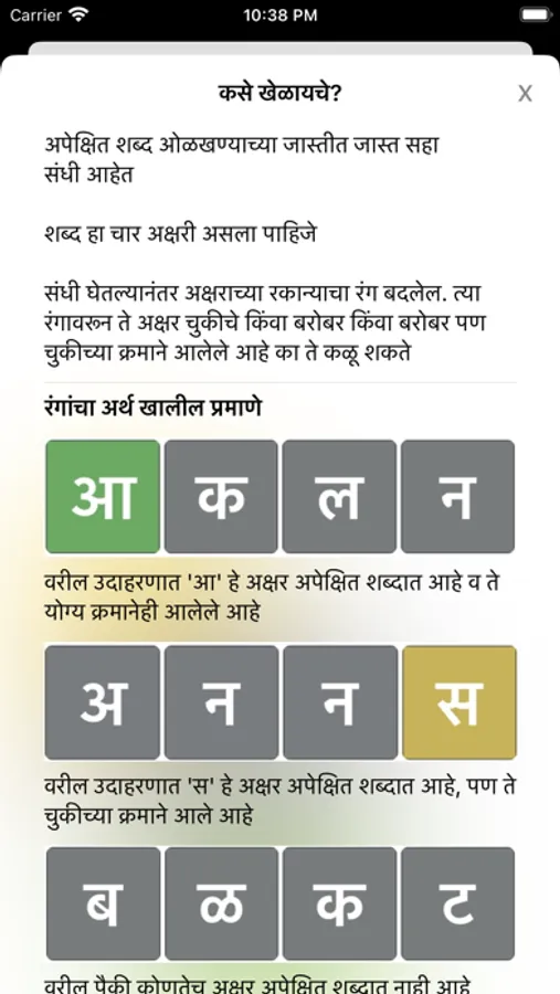 In the game, you have 5 tries to guess a word. Once you enter the guess, the tile either turns gray, indicating that the letter is not in the word, yellow, indicating that it is in the wrong position, or green, indicating that it is in the right position. As the Marathi language's letters work a little differently with vowels being combined with consonants, the game has been designed to take that into account.