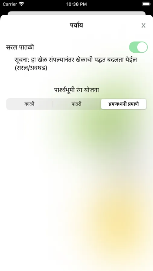 हा खेळ दोन पद्धतीने खेळता येतो, सरल व कठीण. कठीण पद्धतीने खेळतांना काना, मात्रा व वेलांटी असलेले शब्दही गृहीत धरण्यात येतात. तुम्ही app ची रंगसंगती (color theme) पण बदलू शकता.