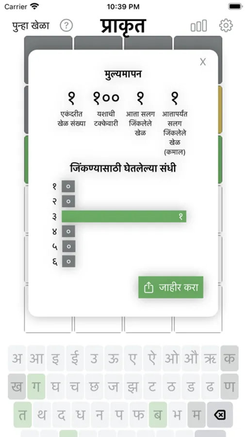 App मध्ये खेळाची आकडेवारी पण दिसते. उदाहरहणार्थ, तुम्ही किती खेळ खेळले आहात, कितीदा जिंकले, इत्यादी, हे सगळे दिसते. खेळ झाल्यावर तुम्ही तुमचे मराठीतले प्रभुत्व दाखवायला मित्रानांही पाठवू शकता!