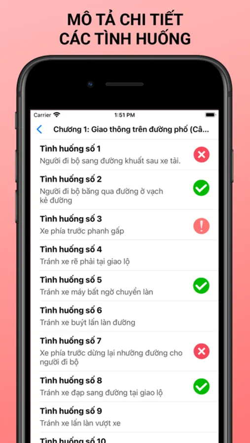 Chương I: Gồm 29 tình huống từ 01 - 29 xoay quanh các tình huống thực tế thường xuyên gặp phải khi tham gia giao thông trên đường phố trong khu đô thị, khu dân cư đông đúc