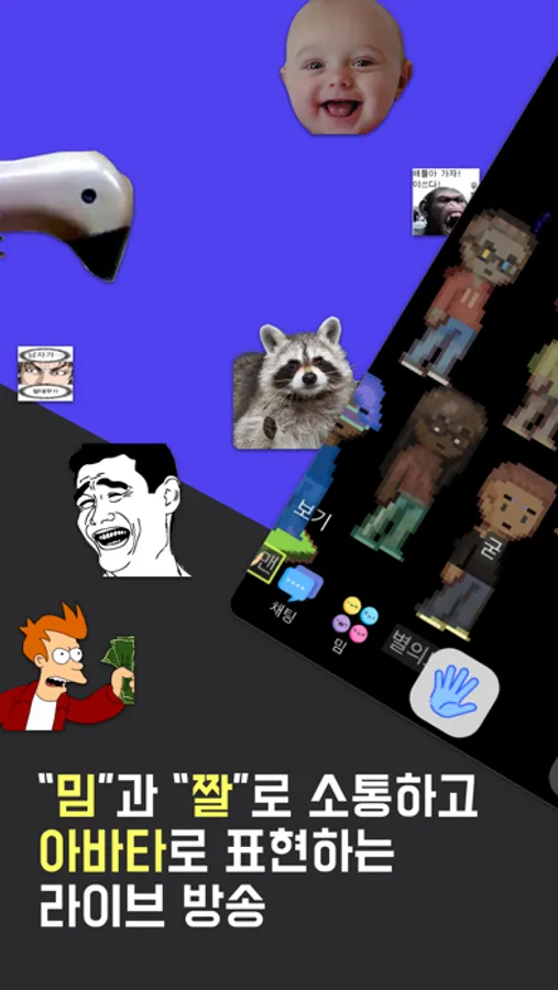 모클랩은 커뮤니티와 함께 밈과 아바타를 사용하여 소통할 수 있는 라이브 방송 앱입니다.