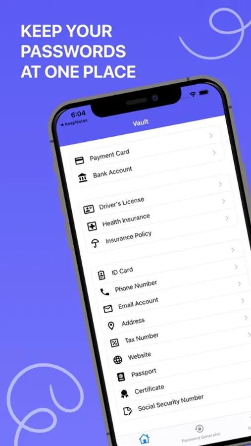 • Store information like credit cards, debit card, addresses, secure notes, bank accounts, driver licenses, Health Insurance, Insurance Policy, passports, Certificate, ID Card ,Cell Phone Info , Calling Card, SSH key and more.