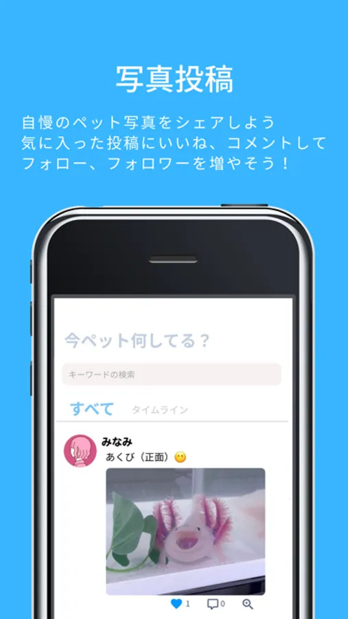 当機能は自慢のペット写真を投稿できたり、気に入った写真にいいね・コメントができるいわゆるSNS機能です。