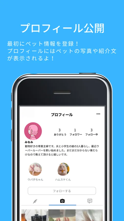 投稿者のプロフィール画面より、ペット情報をチェック!フォロー、お知らせ機能もあります。
