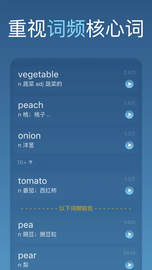 大部分同学背单词是目标导向的,那当然先学高频常考的以达成高性价比,我们给出了每个单词的词频/含义的高低权重(可筛选),并会在后续给出核心词知识图谱。