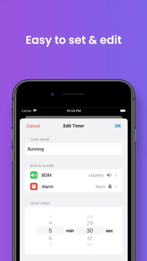 Just set the timer, background music, and alarm on the settings screen, then play!